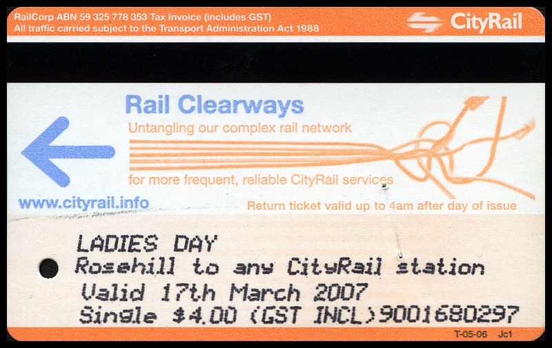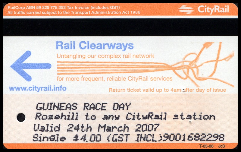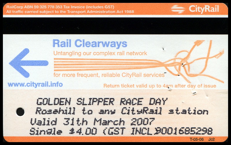 2007 - Golden Slipper CarnivalPage created Saturday, 14th March, 2009 - HTML 4.01 TransitionalLast modified/checked: Sunday, 1st November, 2009 The Autumn Racing Carnival is held at Rosehill Racecourse on three consecutive Saturdays during March/April each year. There are three days to the carnival, these being Ladies Day, Guineas Day and Golden Slipper day. A flat fare single was provided for each of the three days of the carnival as shown below. These pre-printed tickets were available from roving ticket sellers at Rosehill platform. All three of the $4.00 single tickets were printed on orange Clearways T-05-06. |